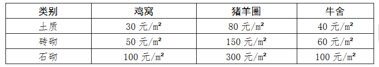 2.另杂棚(指大牲畜有顶棚)柱头高≤2米,按40元/m²计算,柱头高>2米每平米增加1元,以3米为限。