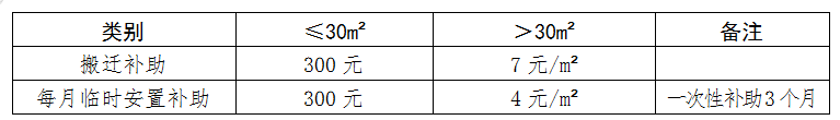 (一)拆迁房屋搬迁补助标准(一次性):建筑面积≤30m²按300元补助,建筑面积>30m²按10元/m²补助。